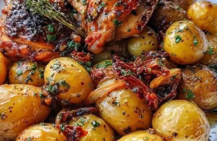 Few meals are as comforting and satisfying as a perfectly roasted chicken paired with tender baby potatoes. This Roasted Chicken with Baby Potatoes and Herbs is a true one-pan wonder. The chicken is seasoned with a flavorful blend of herbs, spices, and a hint of mustard, then roasted until golden and juicy. Alongside, baby potatoes caramelize beautifully with garlic, onion, and sun-dried tomatoes, absorbing all the rich pan juices. It’s a dish that fills your home with irresistible aromas and transforms an ordinary dinner into something special.